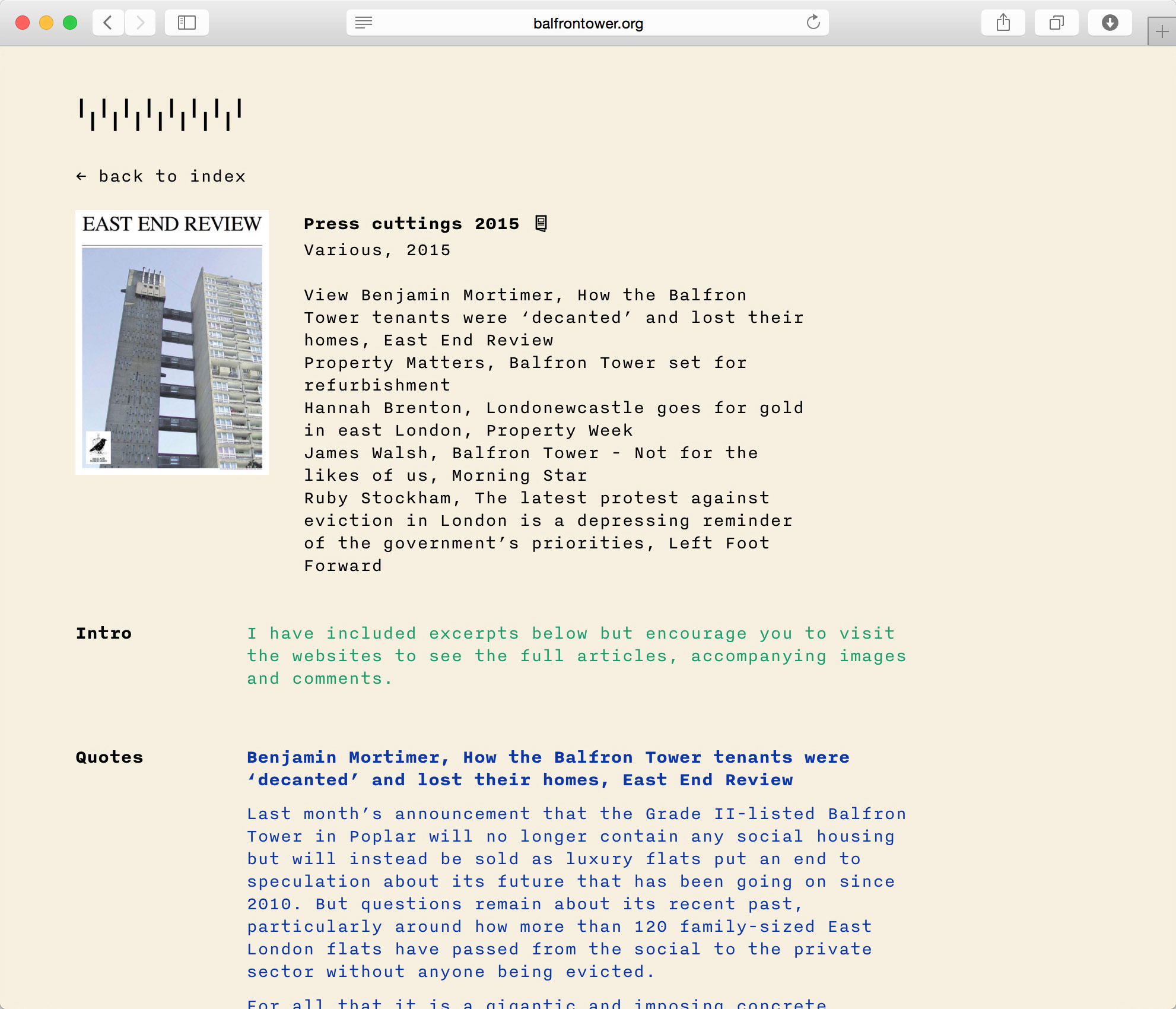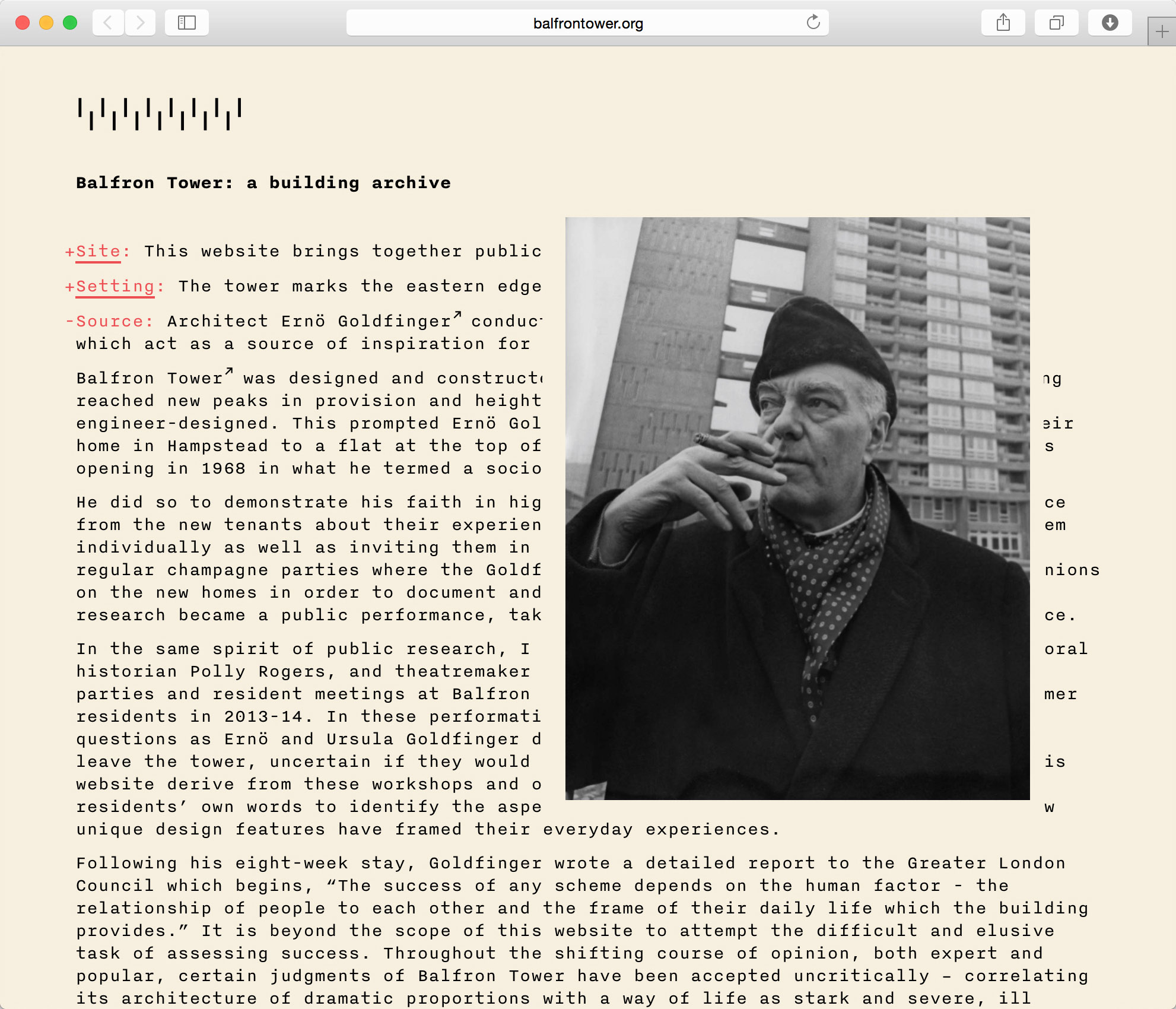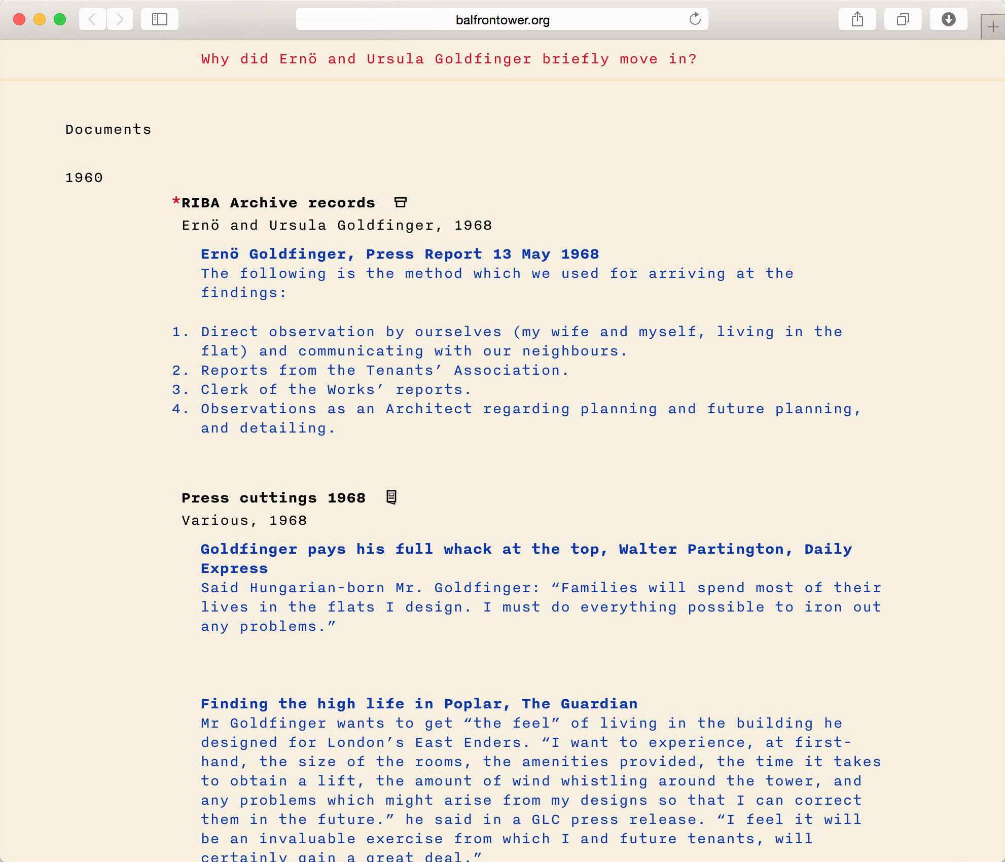 I collaborated with designer Duarte Carrilho da Graça to make www.balfrontower.org, an open-access website as a vehicle to communicate this volume of material which playfully reflects the aesthetic of Balfron Tower – an impossibly tall tower of 120 documents spanning five decades. It is crowned with Balfron’s familiar motif of arrow-slit windows in stepped rhythm. But here they don’t pierce sheer concrete walls or cascade down the façade like rain. They lie against a beige background, atop an impossibly tall tower of text that rises and rises as the user scrolls and scrolls through the documents stacked chronologically. When you click on these documents you are whisked away to other pages, from which complete versions of the documents can be downloaded in full or selected quotes viewed in blue type, my explanatory comments in green, and comments from external contributors in red.