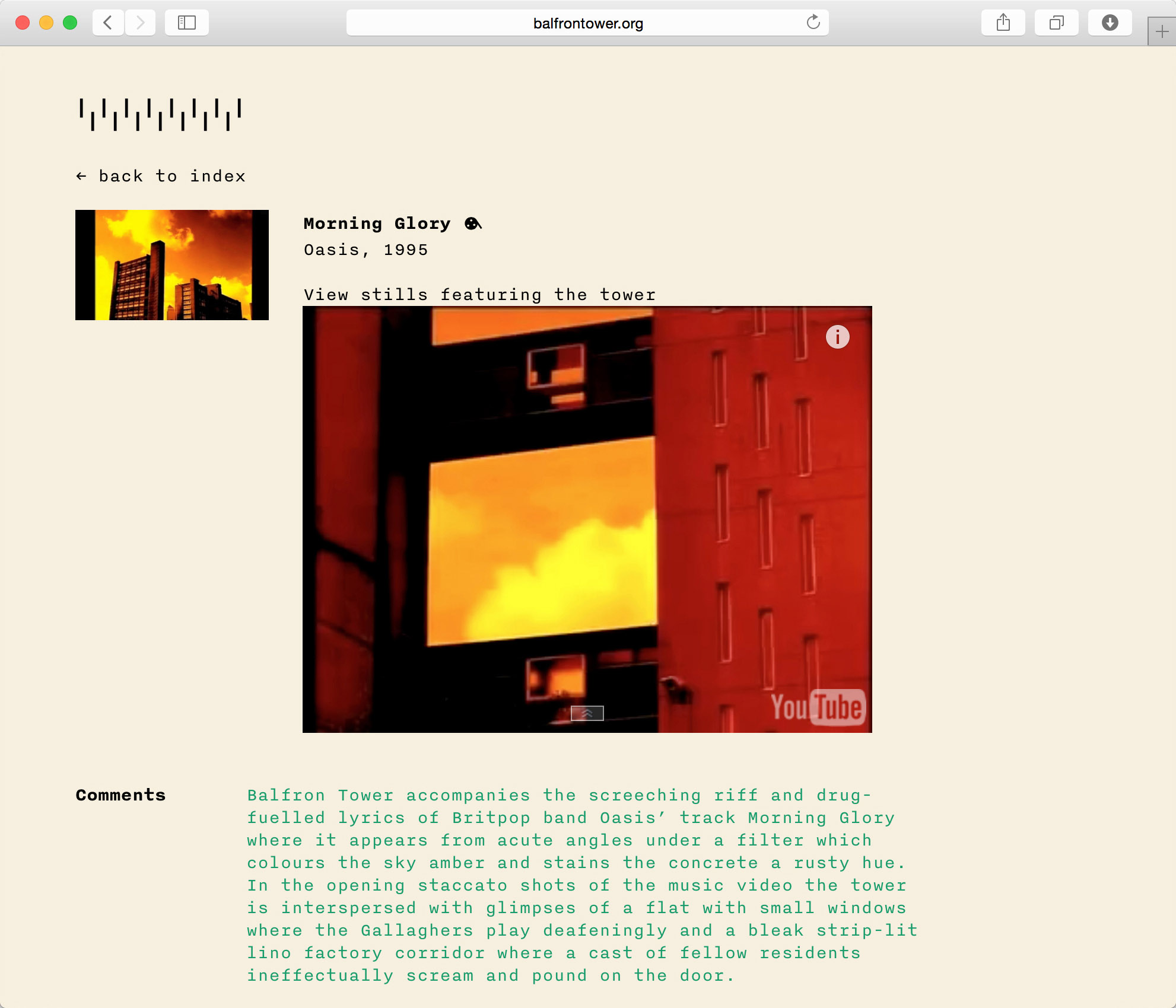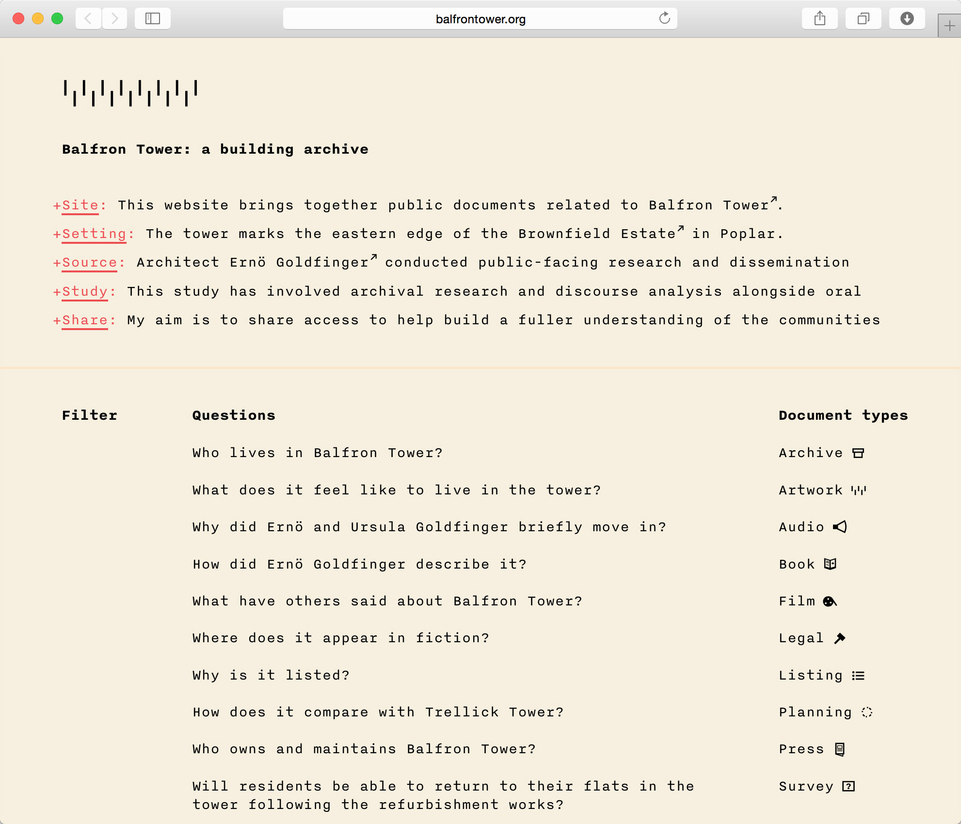 For ease of understanding, the material is categorised under ten document types and filtered through a dozen questions. The questions are loosely grouped around three subjects; the experience of living in Balfron Tower; opinions of the tower from those outside; and how the ownership, architecture and occupancy of the tower will change following regeneration works.