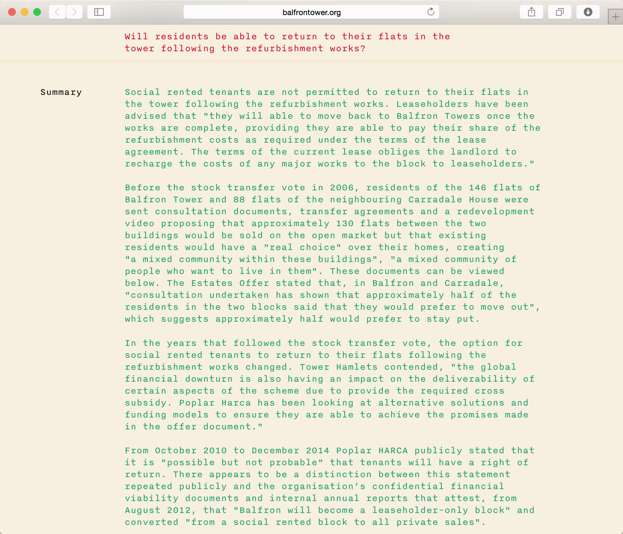 I coordinated the timing of the website to a month before the date that had been earmarked for the planning application to provide a resource for those looking to comment or object to plans which would lead to Balfron’s privatisation. The documents included made clear the statutory affordable housing targets and best practice guidelines on accountable regeneration that the planning application failed to meet. To negotiate the associated stringent copyright restrictions, I transcribed all archival, academic and planning material as well as the content of films and lectures. I isolated key quotes within documents that revealed how decisions were framed and structured, taking inspiration from the websites of other community groups, bloggers and campaigners who shared resources and meticulously highlighted policy discrepancies in planning documents. While providing the facility for users to search these documents, I also listed thirteen simple questions that residents had raised during our workshops and oral history interviews. In the absence of responses from the official bodies to whom they had directed these questions, I began to compile appropriate sources to provide direct answers. The questions, when clicked, provide a short answer and selects relevant documents from the timeline below, assembling quotes which act to provide a more detailed response.