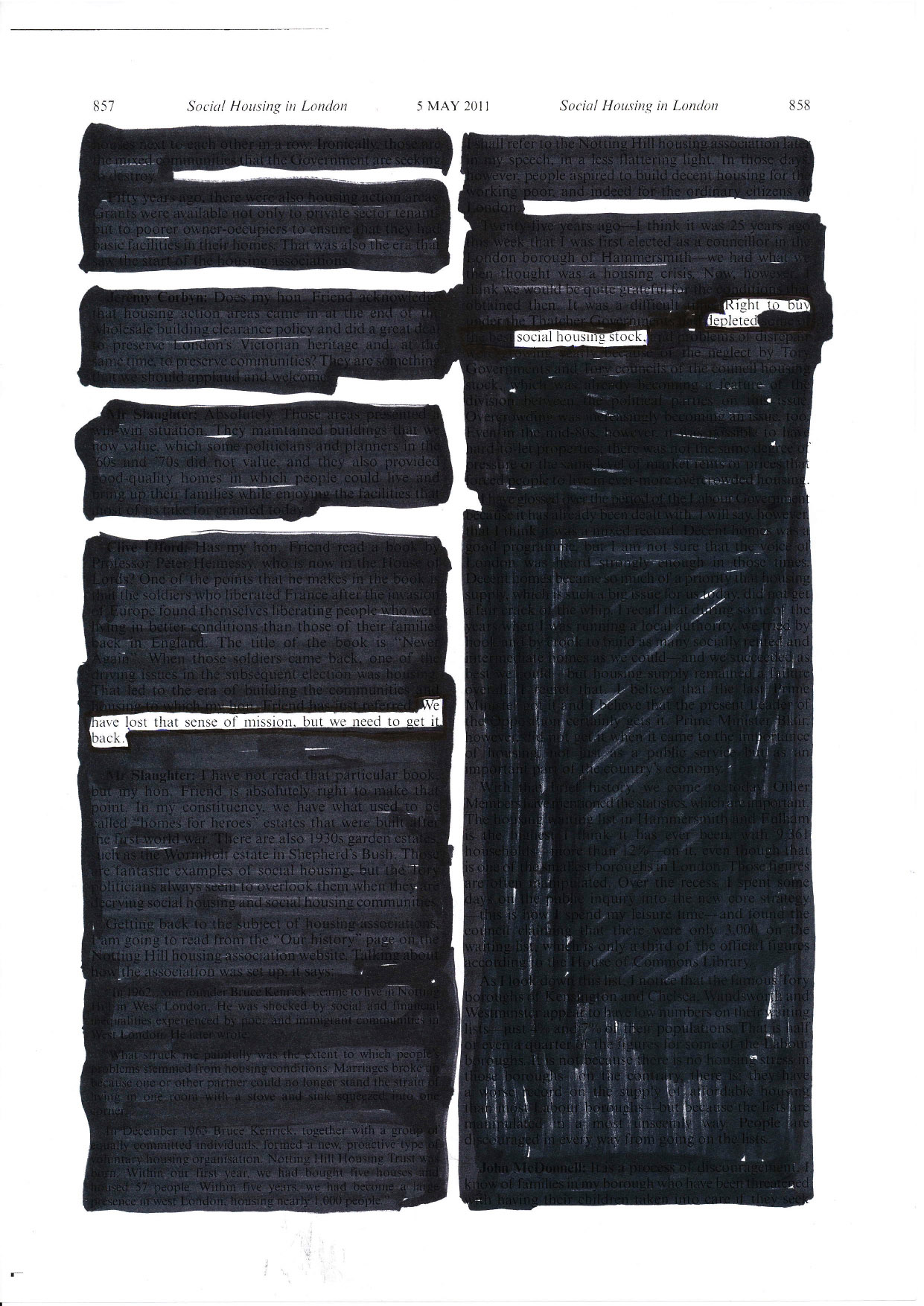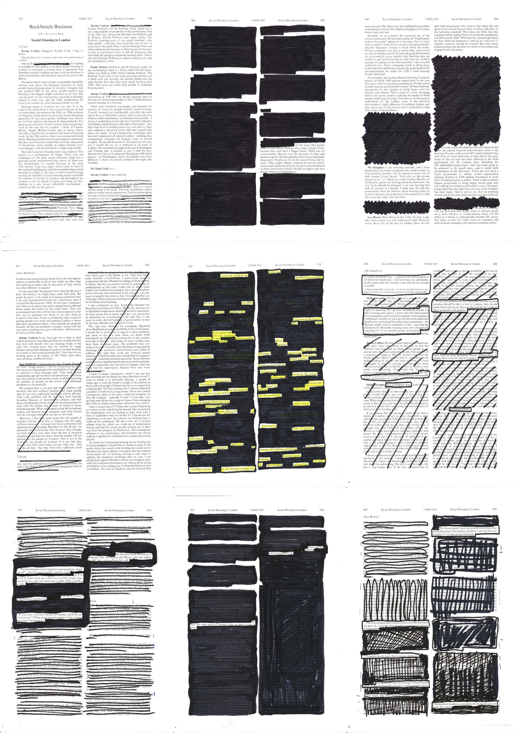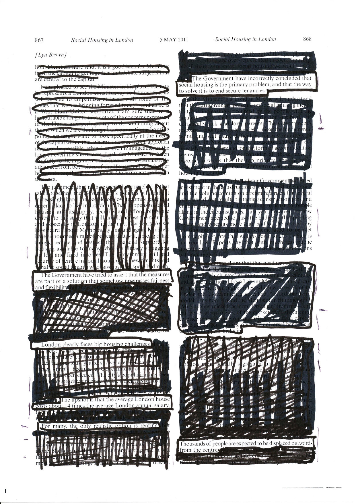 At Samuel House, a block in the soon-to-be demolished Haggerston Estate in east London, I gave residents a black marker pen and asked each of them to read several pages of this Hansard, to leave in words they believed represented their opinions and experiences and to black out everything else.