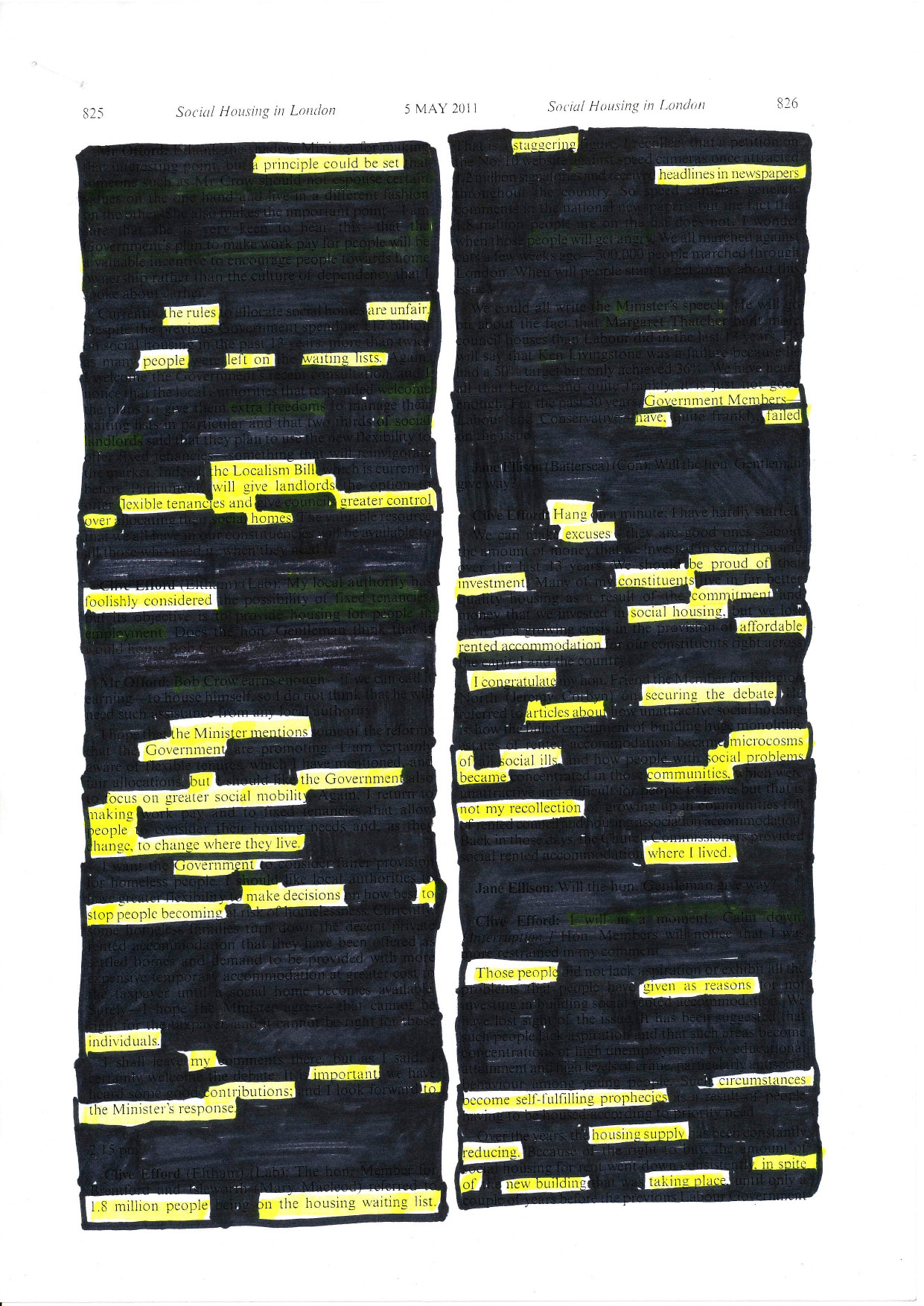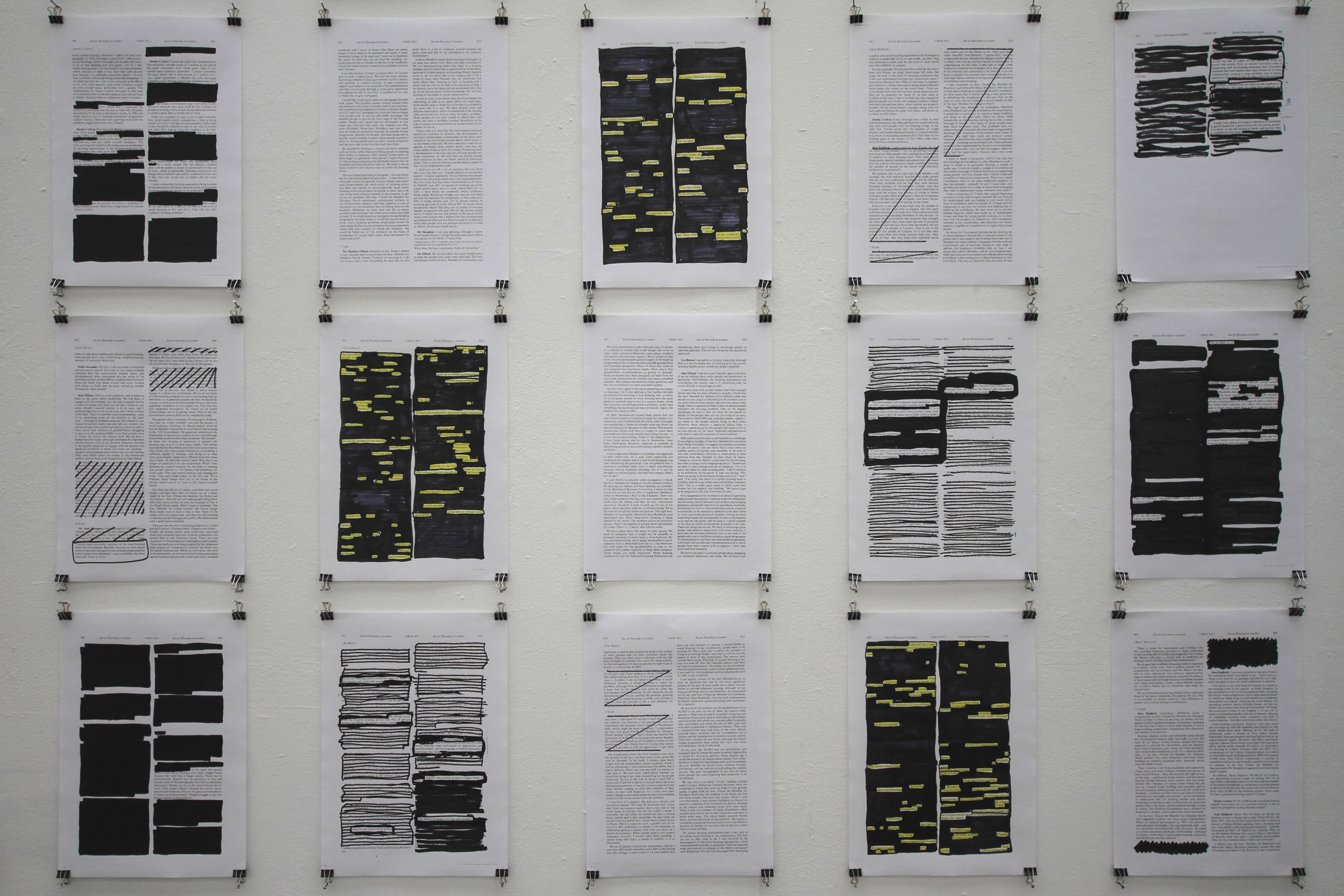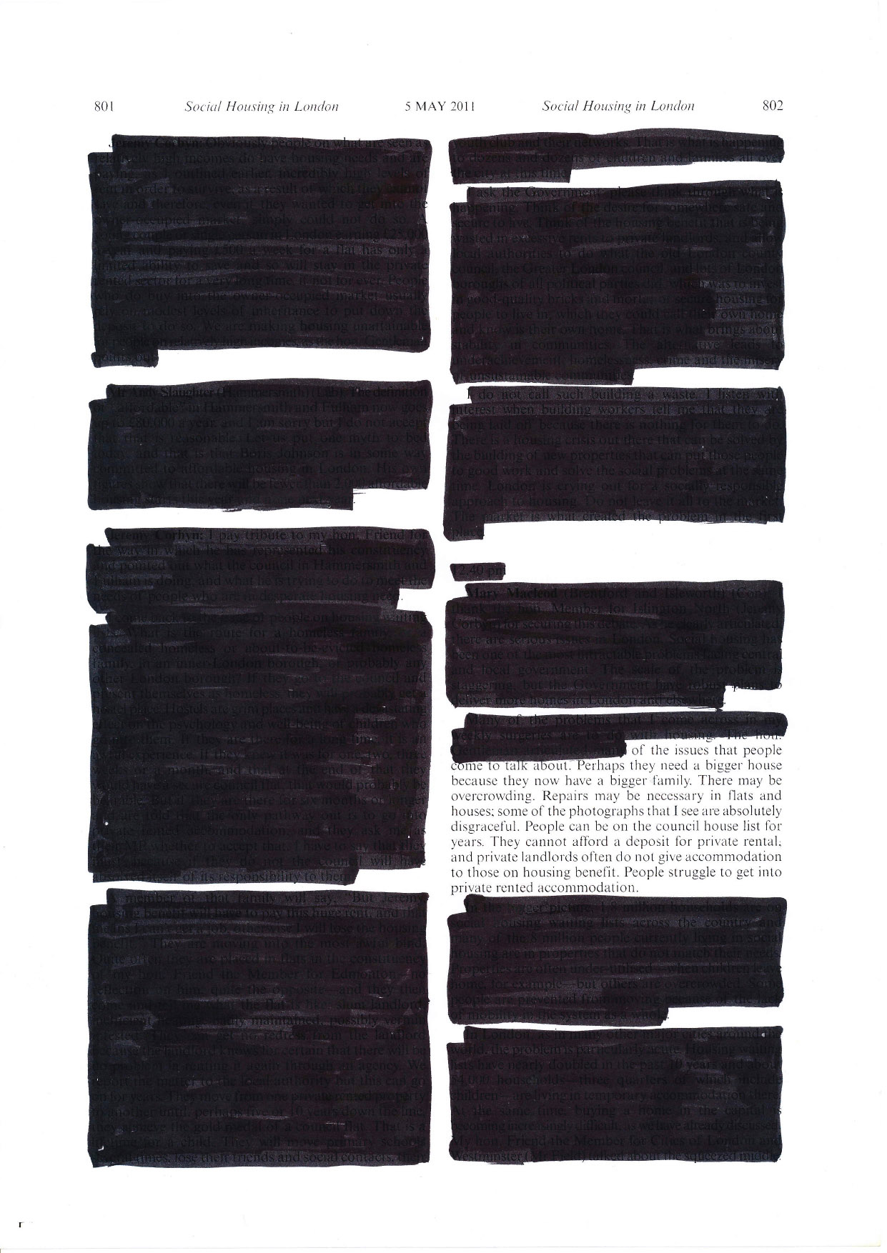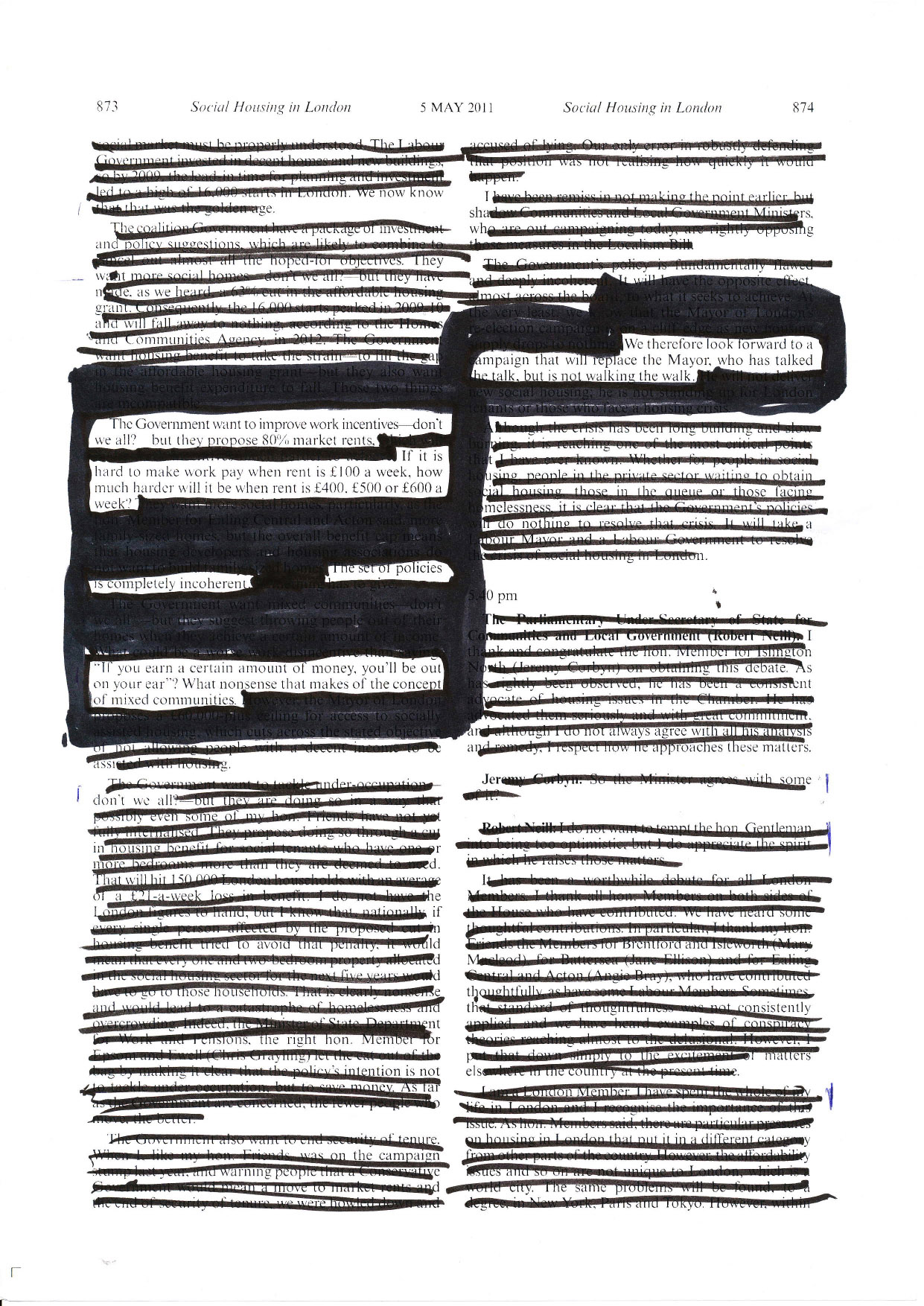 At Samuel House, a block in the soon-to-be demolished Haggerston Estate in east London, I gave residents a black marker pen and asked each of them to read several pages of this Hansard, to leave in words they believed represented their opinions and experiences and to black out everything else.