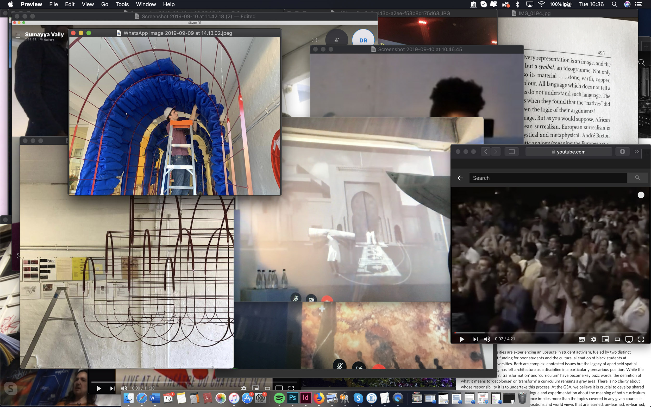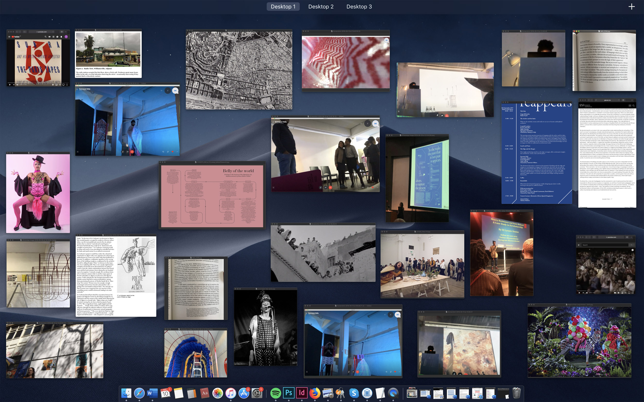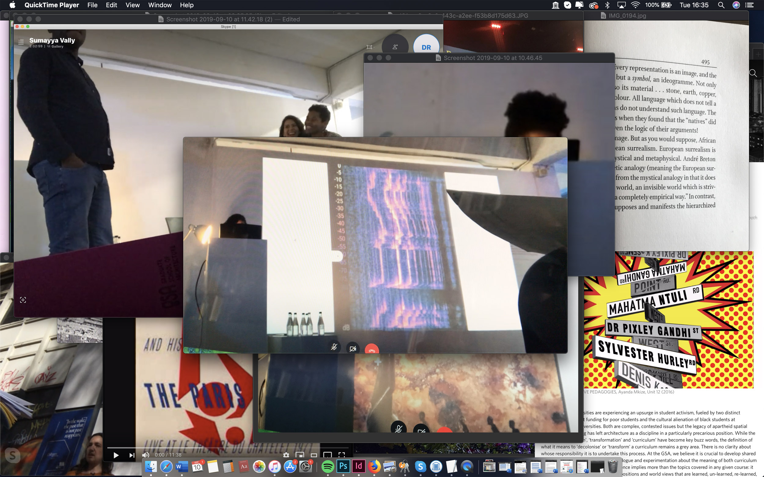 This piece was written as a performed contribution to the Institutional Imaginaries: Conversation Rooms symposium organised by Huda Tayob at the Graduate School of Architecture. David and Thandi attended the day by skype – in a time before the zoom pandemic – and attempted to share these thoughts and a screen-performance of tiled windows, artworks, screenshots and texts, somewhat-but-not-entirely scuppered by broken bandwidth. Huda asked us: What kind of institutional imaginary enables designing speculative worlds, drawing on the past for a different future? We responded: