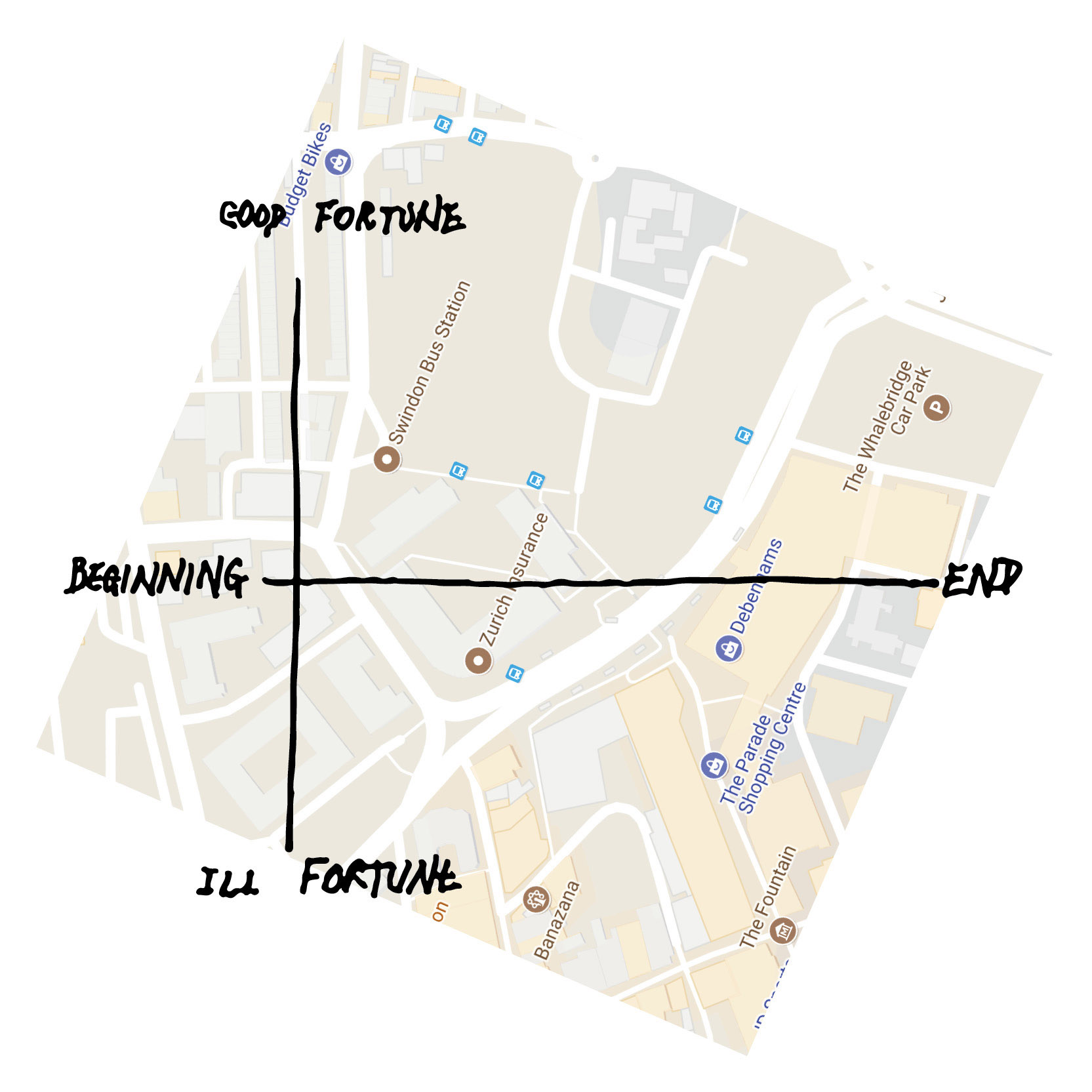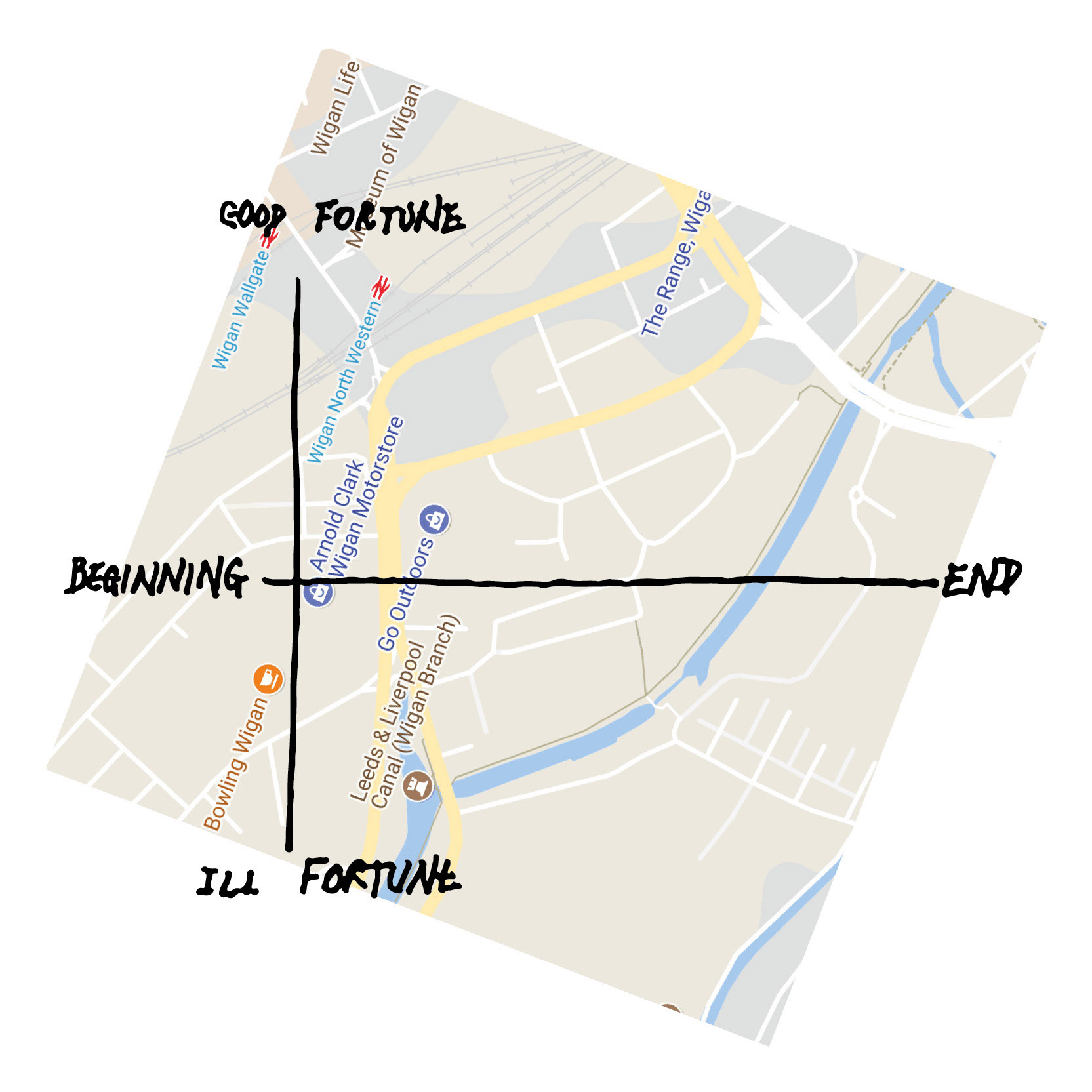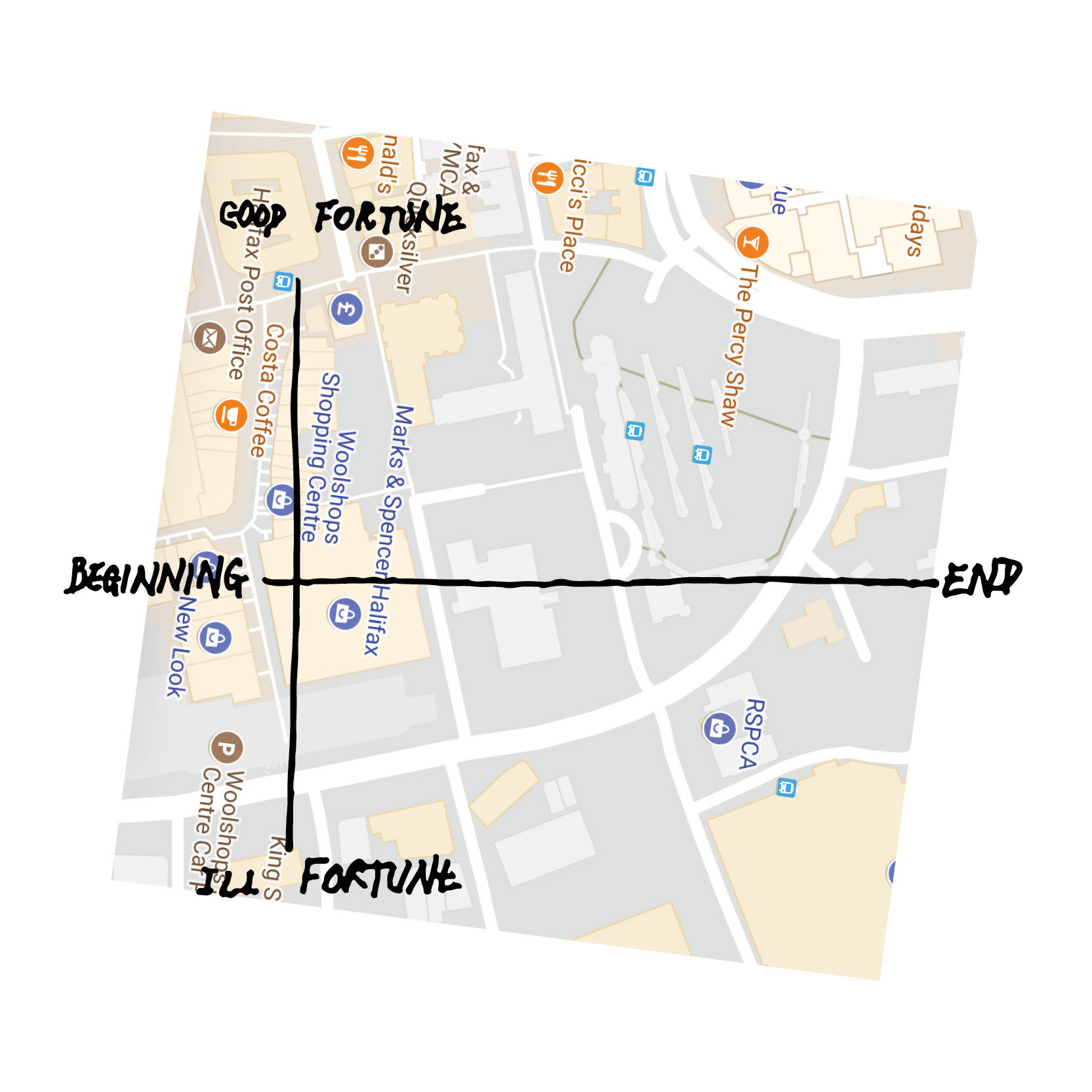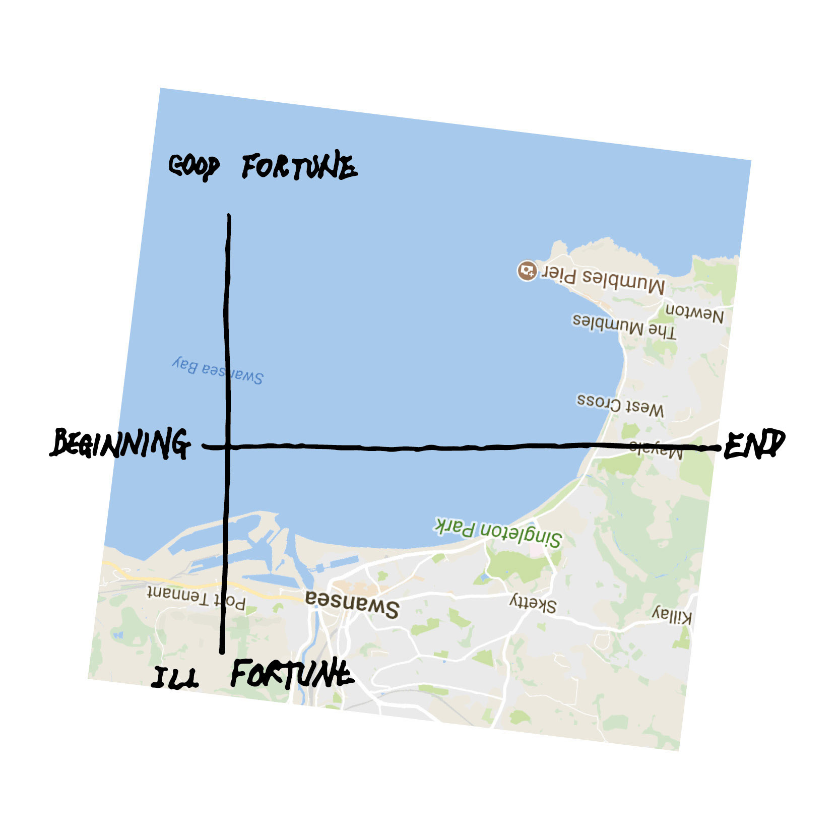 In his lectures on the universality of fiction, Kurt Vonnegut stands beside a blackboard onto which he plots the common patterns of stories in arcs of chalk. The complexity of Hamlet, Cinderella or the New Testament absurdly distilled. An opportunity, Vonnegut explains, to share the thwarted thoughts of his rejected Master’s thesis. He draws a single line charting the central character’s progress, sinuously or abruptly stepping from good to ill fortune and back again. The students laugh because they know it is too easy.