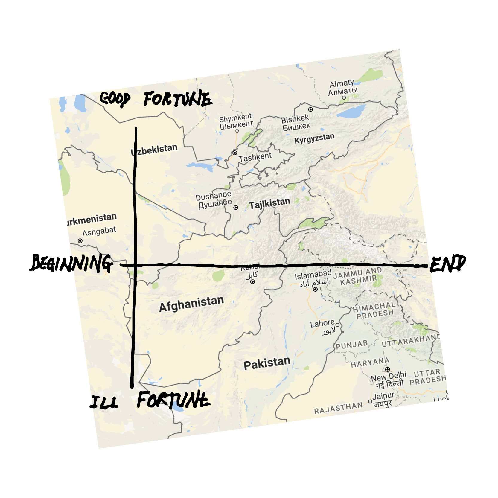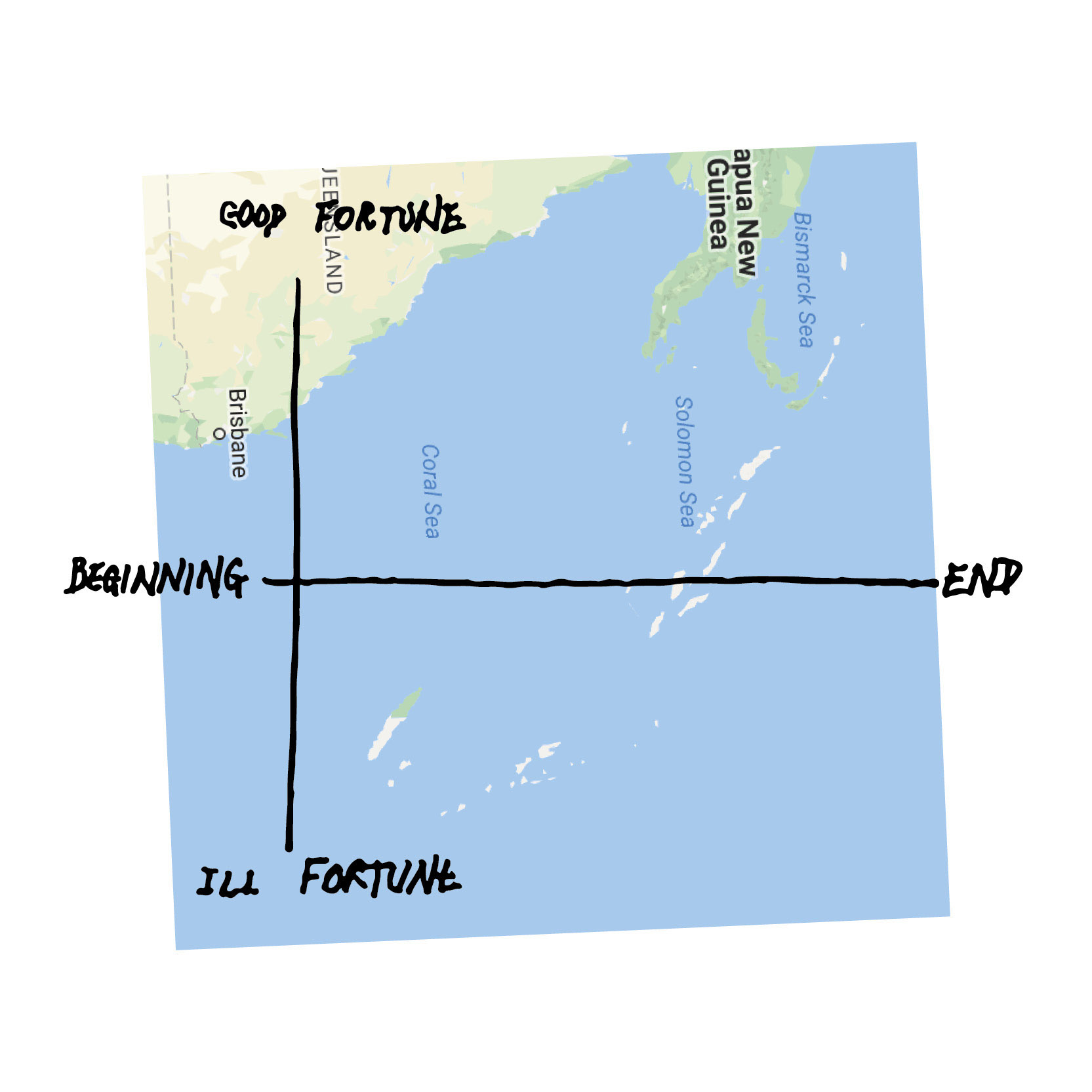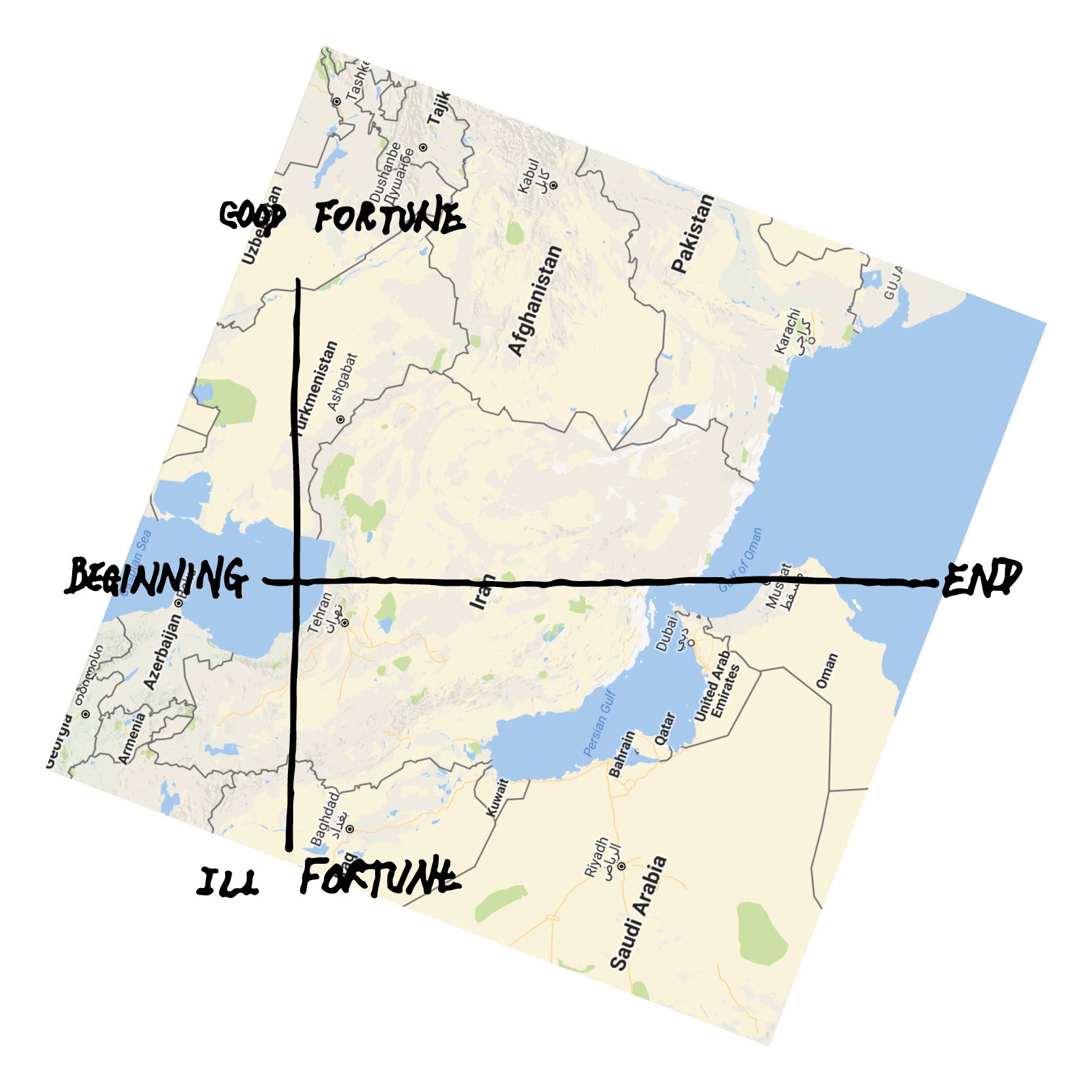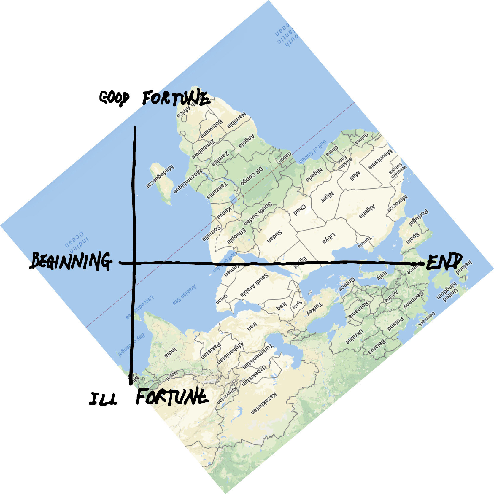 A man scratches chalk against board. “I want to share with you something I’ve learned.” The students in tiered seating break into laughter. It’s not the first time he has done this. “I’ll draw it on the blackboard behind me so you can follow more easily. This [drawing a vertical line] is the G-I axis: good fortune to ill fortune. Death and terrible poverty, sickness down here [pointing to bottom of line], great prosperity, wonderful health up there [pointing to top]. This [drawing a horizontal line] is the B-E axis. B for beginning, E for entropy. Now this is an exercise in relativity, the shape of the curve is what matters, not its origin…”