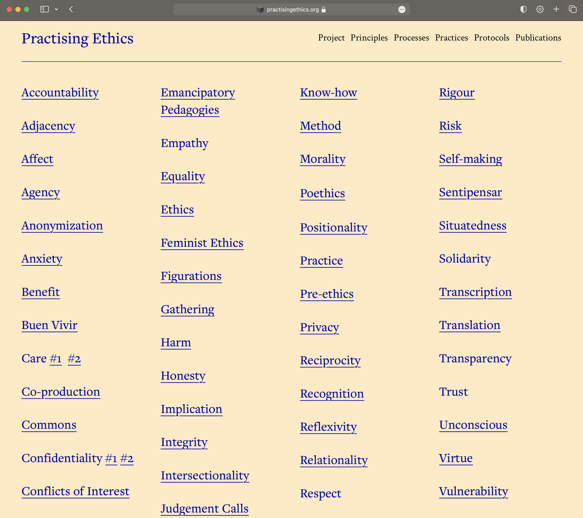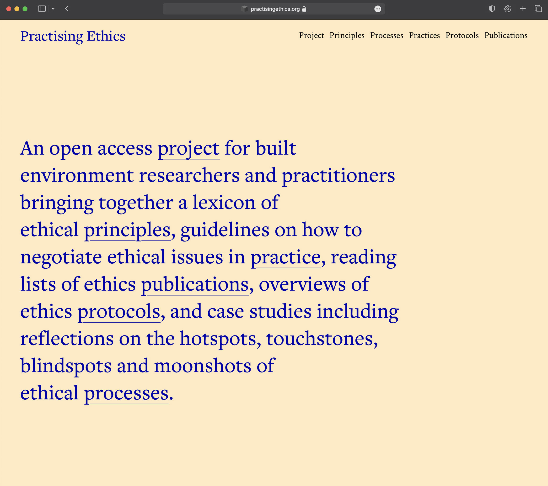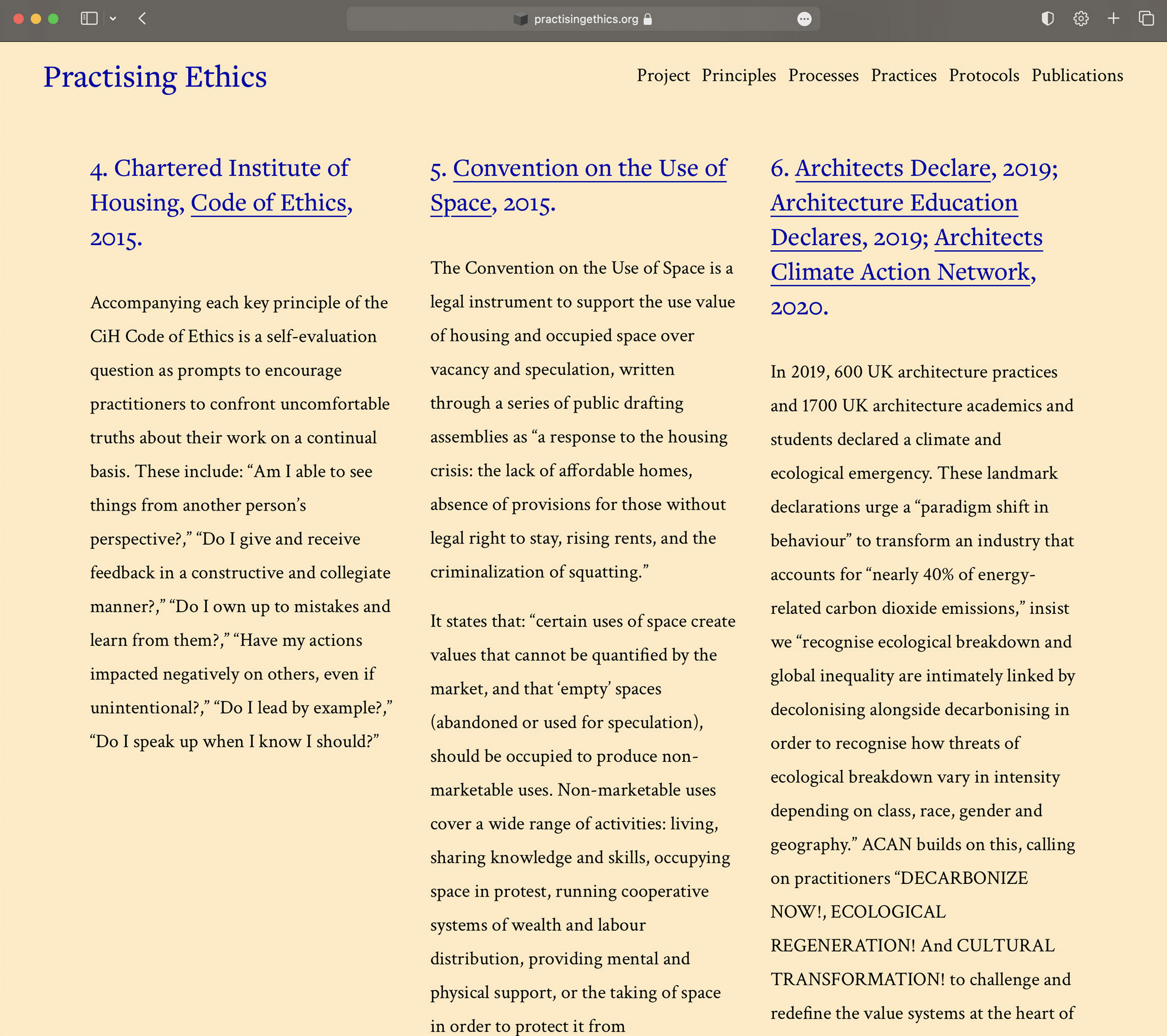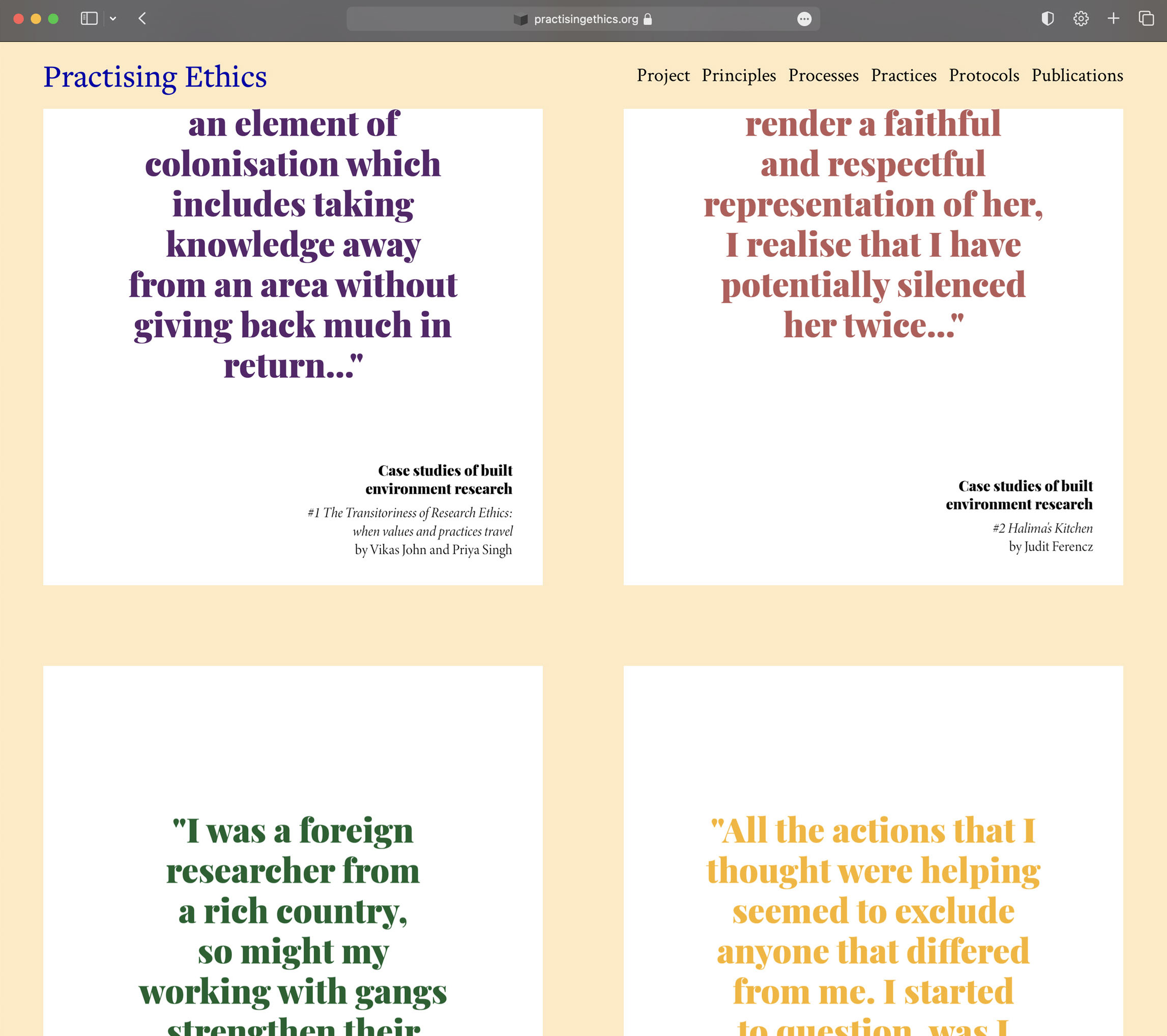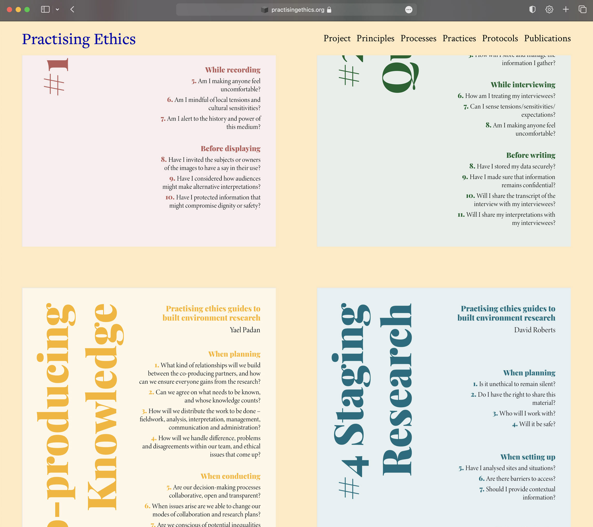 Practising Ethics is open access website for built environment researchers and practitioners bringing together a lexicon of ethical principles, guidelines on how to negotiate ethical issues in practice, reading lists of ethics publications, overviews of ethics protocols, and case studies including reflections on the hotspots, touchstones, blindspots and moonshots of ethical processes.